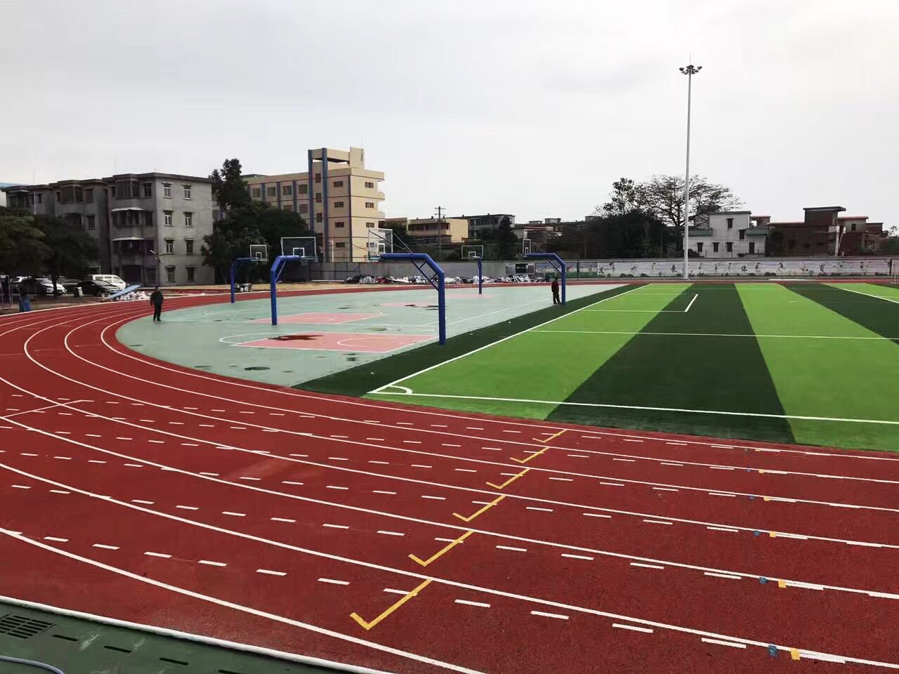 4、混合型塑膠跑道是PU與黑色橡膠顆粒按一定比例混合而成跑道系統。材料運到現場按一定比例混合,加入催化劑攪拌均勻,攤鋪,常溫硫化成型,該面層是現時唯一有國家標準的塑膠面層材料,主要用于專業比賽用場地等。